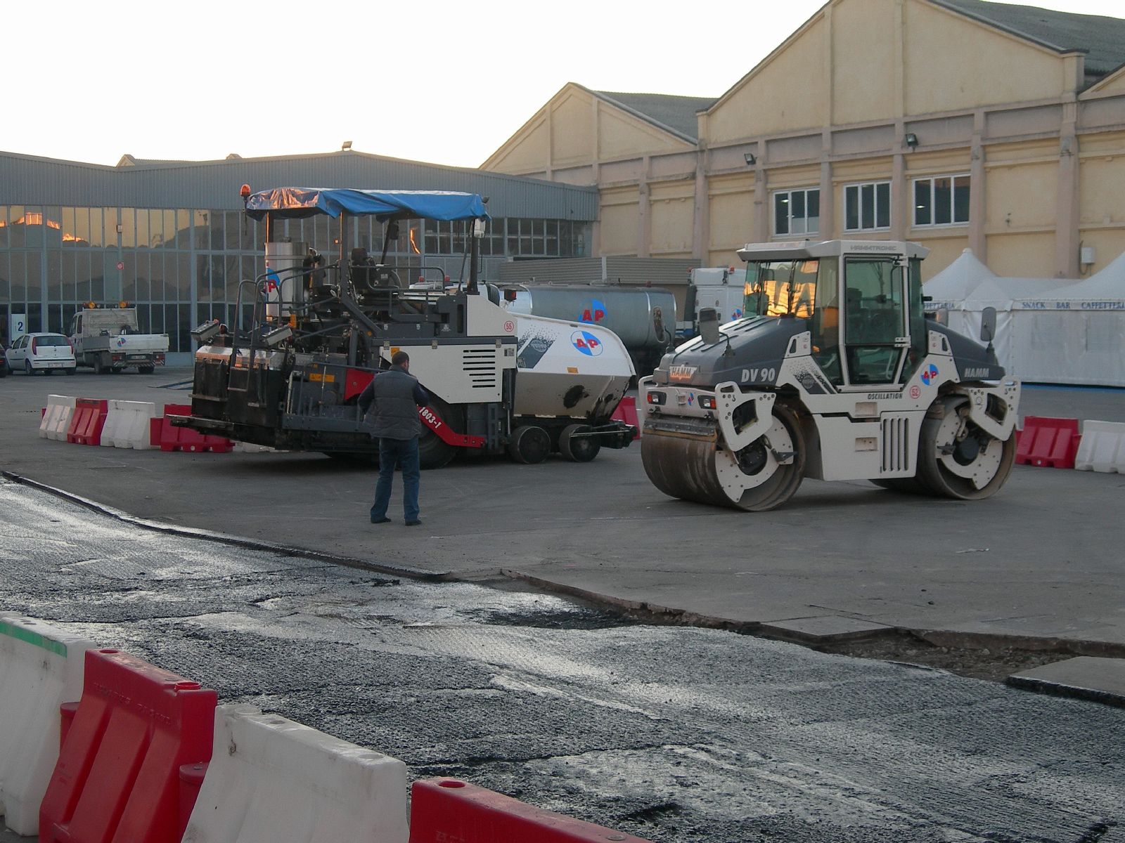 Questi sono i mezzi della ditta asfalti piovese utilizzati per la prova della stesa del conglomerato a basse temperature