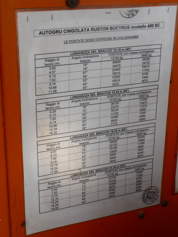 Portate dei vari bracci montabili sulla Ruston-Bucyrus 400-SC.