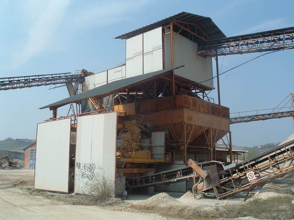 impianto lavorazione inerti. in basso a dx i frantoi, sopra a sx il vaglio rotativo e dx il vaglio vibrante