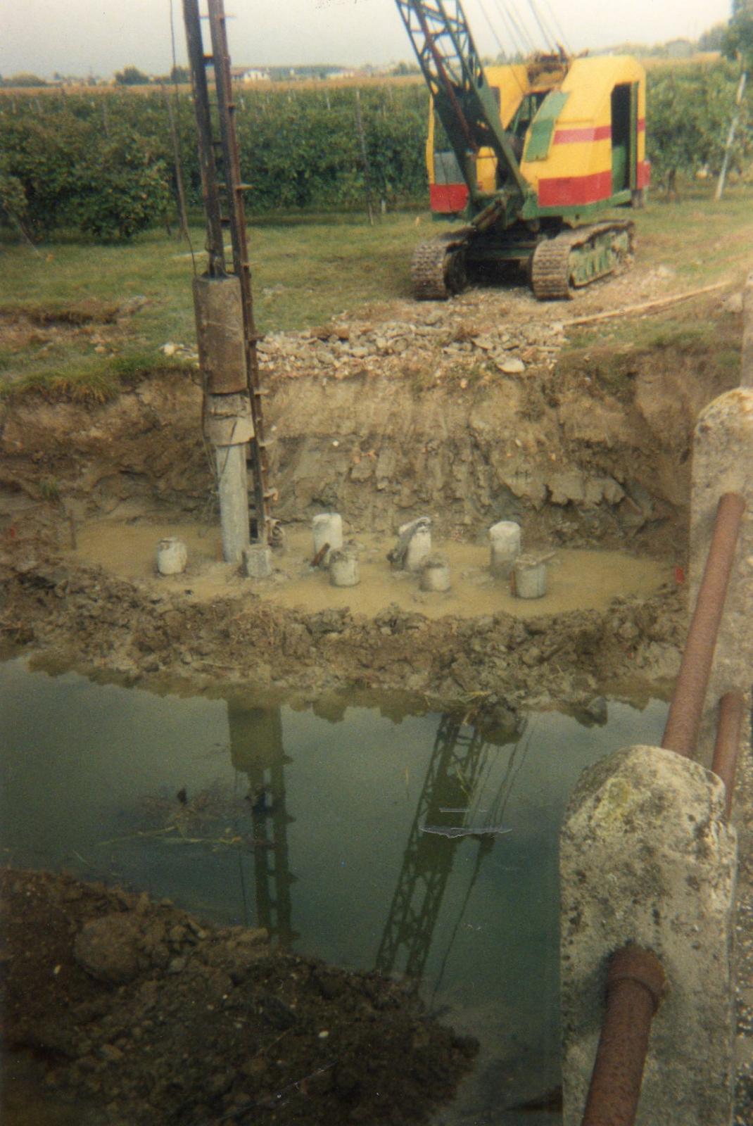 Ruston Bucyrus RB19 con carro NCK infissione pali in c.a. centrifugato per fondazione ponte anni '80